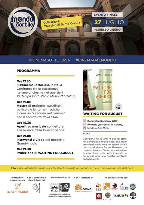 Infine alle 21.30 ci sarà la proiezione del film romeno WAITING FOR AUGUST, mai distribuito in Italia ed ambientato a Bacau, dove per Georgiana (15 anni) stanno cambiando molte cose, ma deve prendersi anche cura dei suoi 6 fratelli con i quali vive. La mamma, infatti, lavora a Torino come badante e fa ritorno solamente in estate. Un’attesa che apre una finestra sull’Italia.