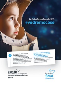 Con la firma del 5xmille in favore di Famiglie SMA si finanziano direttamente la ricerca scientifica e il progetto EAP per la distribuzione del farmaco Spinraza, oltre che azioni concrete che migliorano la vita dei bambini e adulti con SMA ogni giorno, come l’assistenza domiciliare, il supporto psicologico o la formazione di personale specifico.