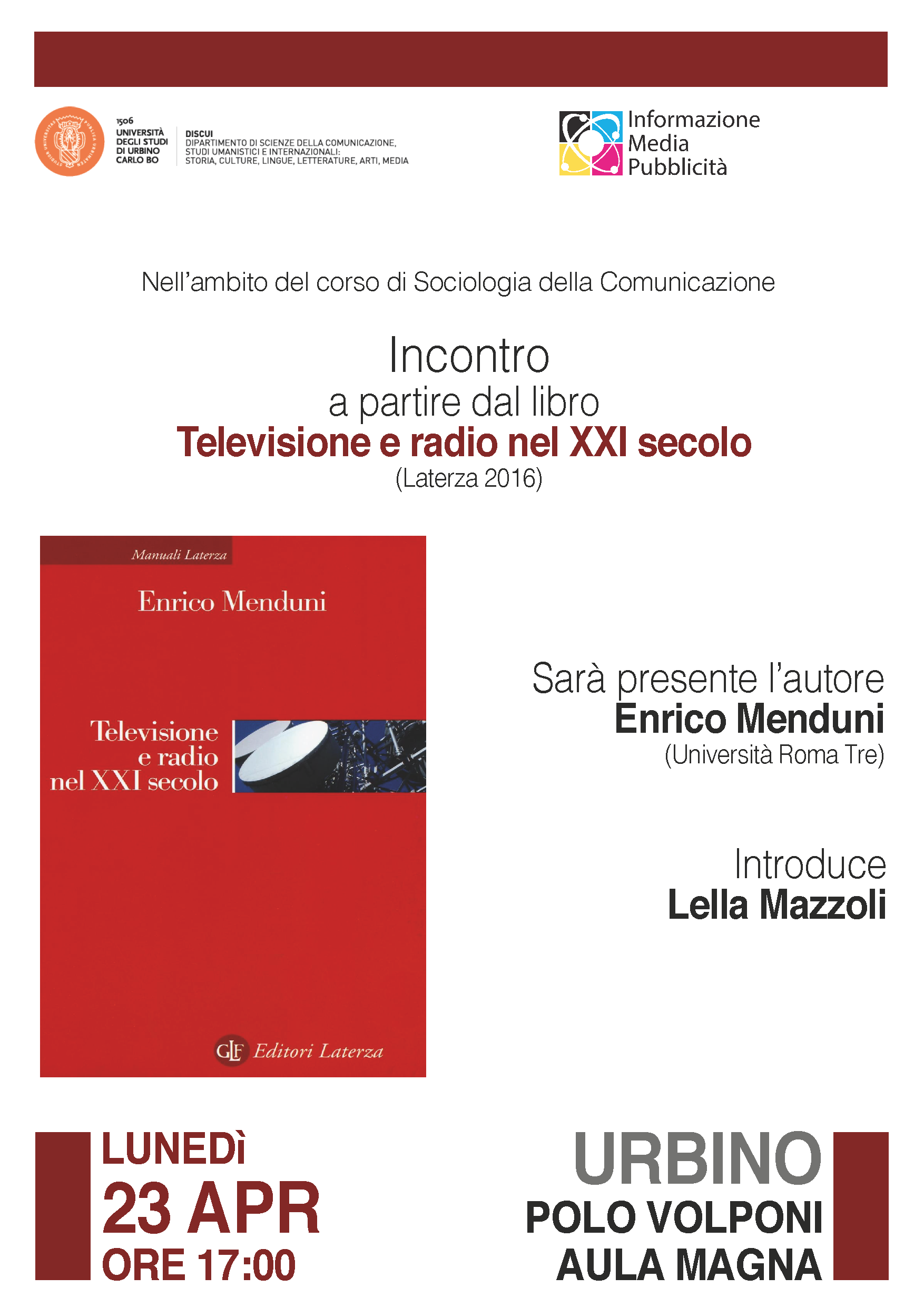 Festival del giornalismo culturale unedì 23 aprile alle ore 17 nell’Aula Magna del Polo Scientifico Volponi (Via Saffi, 15) dell’Università di Urbino Carlo Bo, si terrà l’incontro con Enrico Menduni (Professore, saggista ed esperto di media studies) a partire dal suo libro Televisione e radio nel XXI secolo (Laterza, 2016). L’incontro, organizzato all’interno del ciclo di lezioni del corso di Sociologia della comunicazione della professoressa Lella Mazzoli, intende riflettere sui cambiamenti che hanno attraversato i media mainstream, in particolare la radio e la televisione, e sul confronto, talvolta necessario, con i media digitali. L’incontro è libero e aperto a tutti,