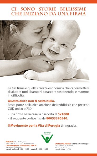 40° Giornata Nazionale per la Vita: basti ricordare anche la recente convenzione con le farmacie del territorio perugino riunite in Federfarma Umbria, che si sono impegnate a promuovere la Culla per la Vita, presidio medico (ubicato nell’area dell’ospedale perugino S. Maria della Misericordia e presso il nosocomio di Città di Castello) che permette di affidare un bambino appena nato alle cure dei servizi sociali in totale sicurezza per il piccolo e anonimato per la madre.