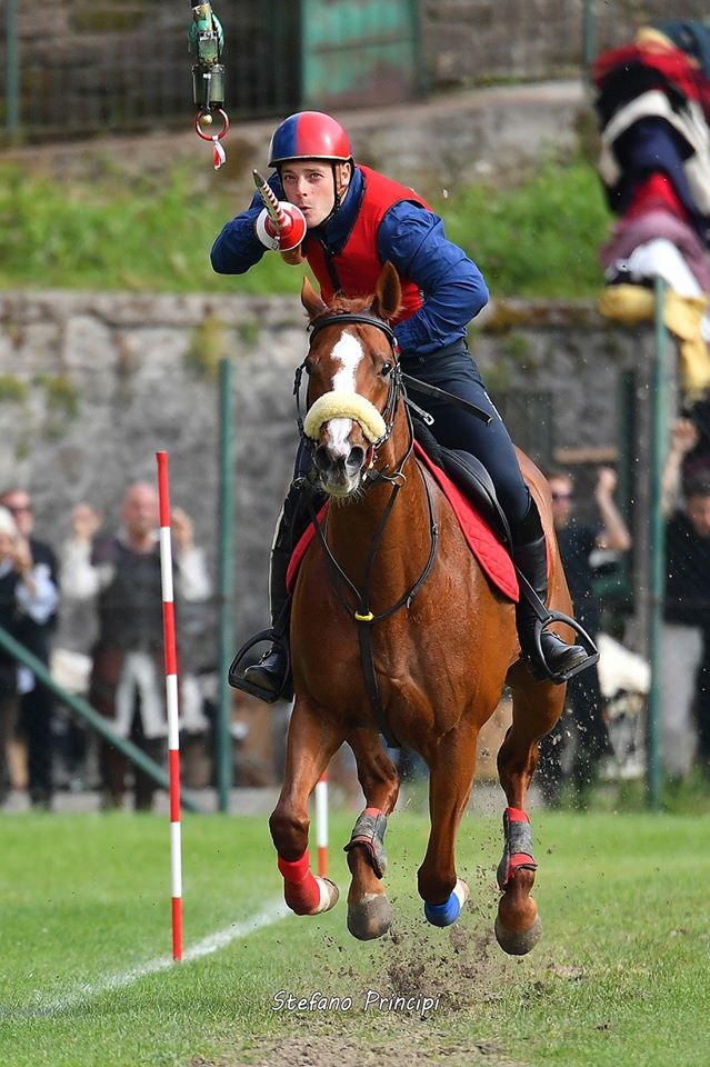 Nell’avvincente gara equestre i cavalieri si scontreranno in un duello diretto. La gara consiste nell’infilare con la lancia un anello sospeso su un braccio meccanico. La caratteristica della corsa è la velocità e la tecnica. Ciascun fantino di terziere deve battere quello dell’altro terziere sul tempo per arrivare prima ad infilare l’anello. Rapidità, buona mira e freddezza sono le armi vincenti del cavaliere che deve infilare l’anello di 10 cm di diametro al galoppo. Un dispositivo elettronico sgancia automaticamente l’anello avversario quando al terzo giro l’altro viene preso dal primo dei cavalieri che arriva sul porta anelli.