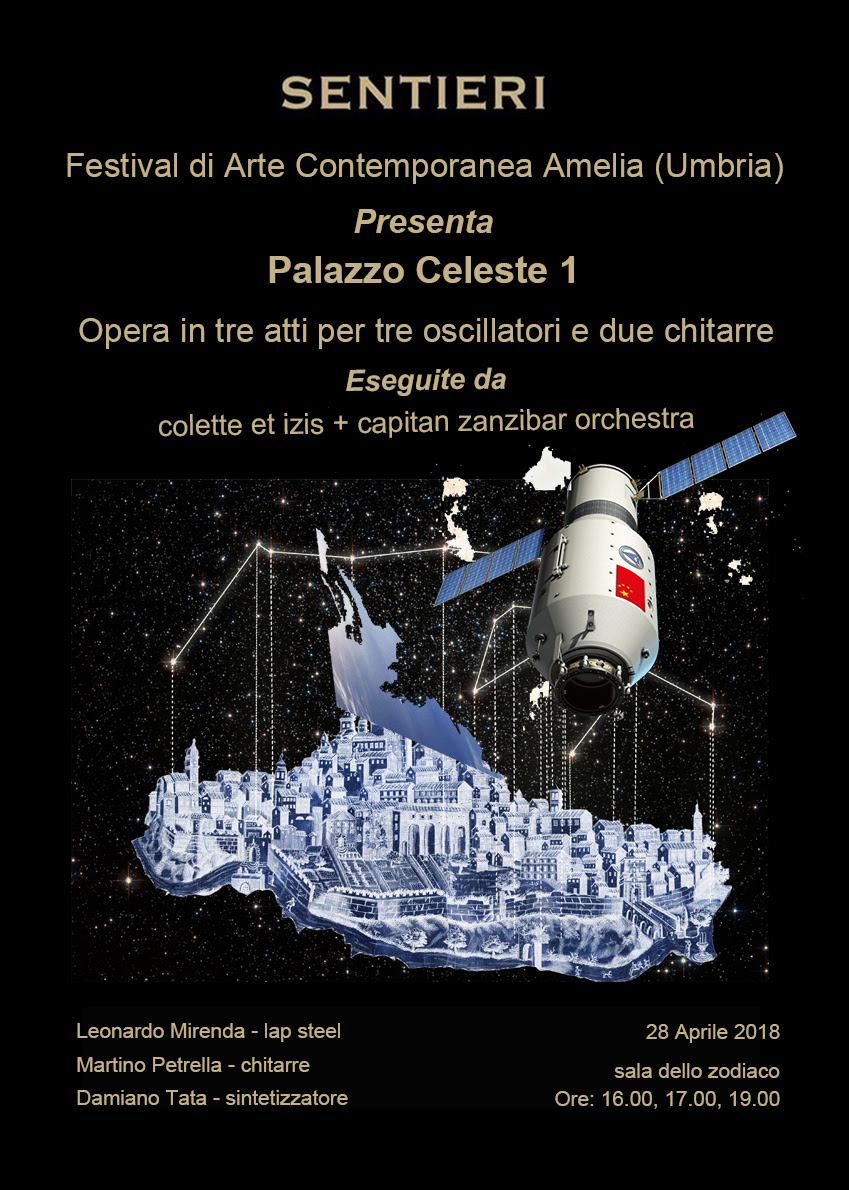 PALAZZO CELESTE 1. A partire dalle ore 16.00 (ore 16.00, ore 17.00 e ore 19.00) si terrà infatti “Palazzo Celeste – 1” – Opera in tre atti per tre oscillatori e due chitarre, eseguita da Colette et Izis + Capitan Zanzibar Orchestra e studiata ad hoc per il Festival “Sentieri”.