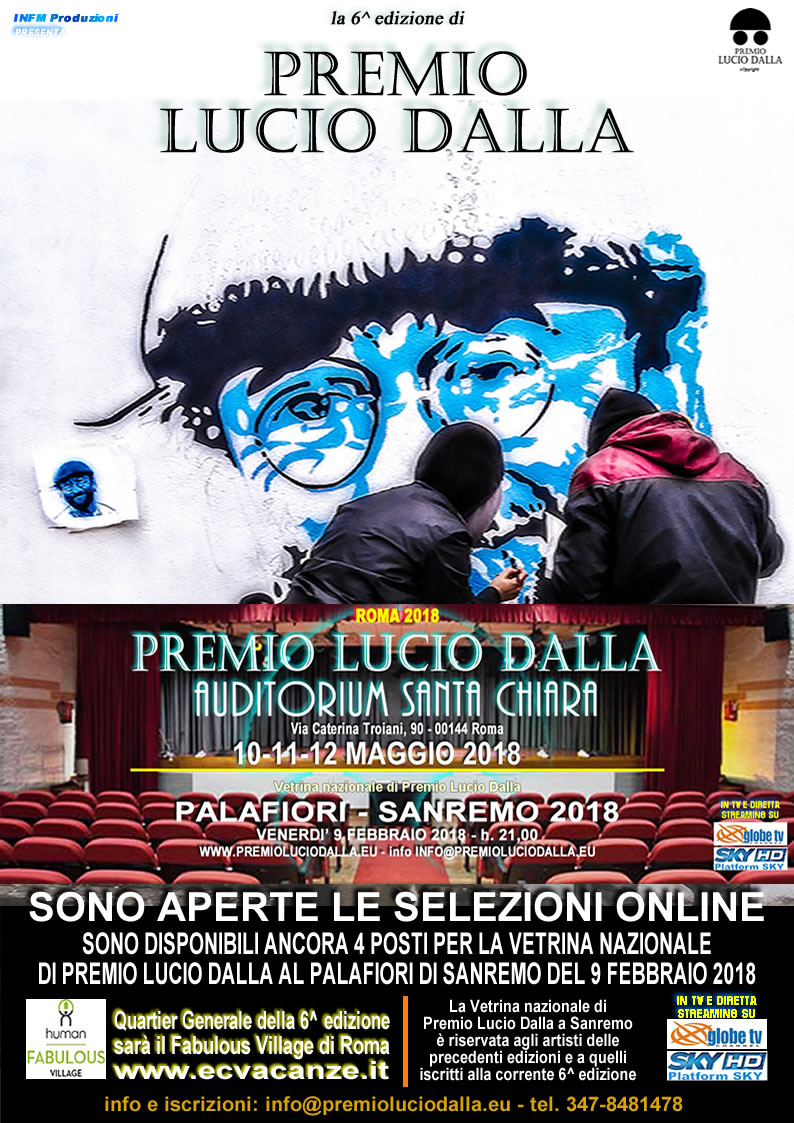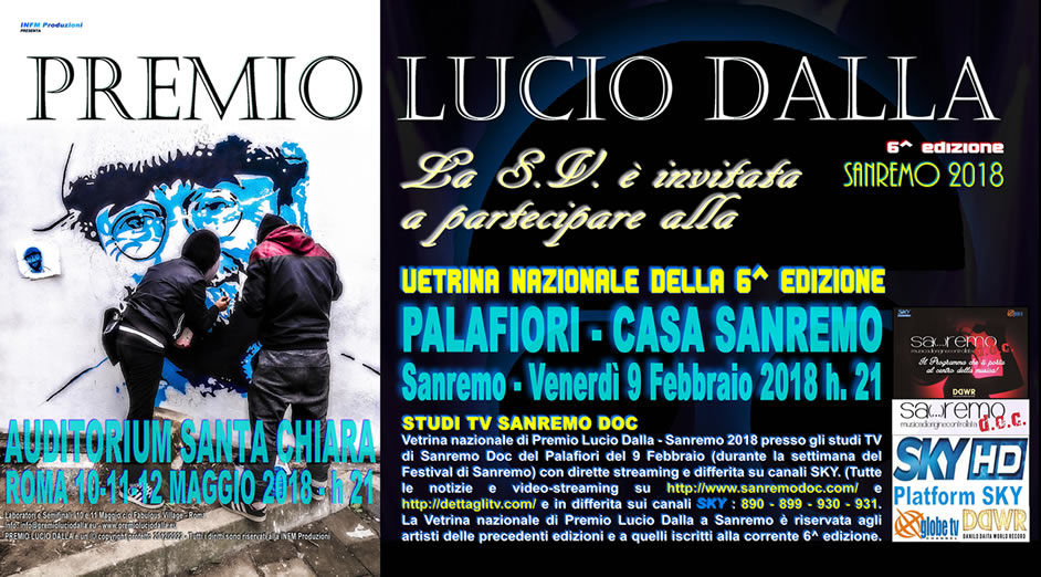 La Vetrina sta attraendo anche l’attenzione di varie radio e tv private nonchè di testate web di tante parti d’Italia. Il Patron Maurizio Meli si ritiene soddisfatto di questi risultati e dà appuntamento a tutti a Venerdì 9 Febbraio a Casa Sanremo – Palafiori alle ore 21 presso gli studi tv appunto di Sanremo Doc e a Roma per la classica 3 giorni delle fasi finali della 6^ edizione fissata all’Auditorium Santa Chiara per i giorni 10-11-12 Maggio 2018. Altre due straordinarie mediatiche occasioni per ricordare e omaggiare il grande Lucio Dalla.