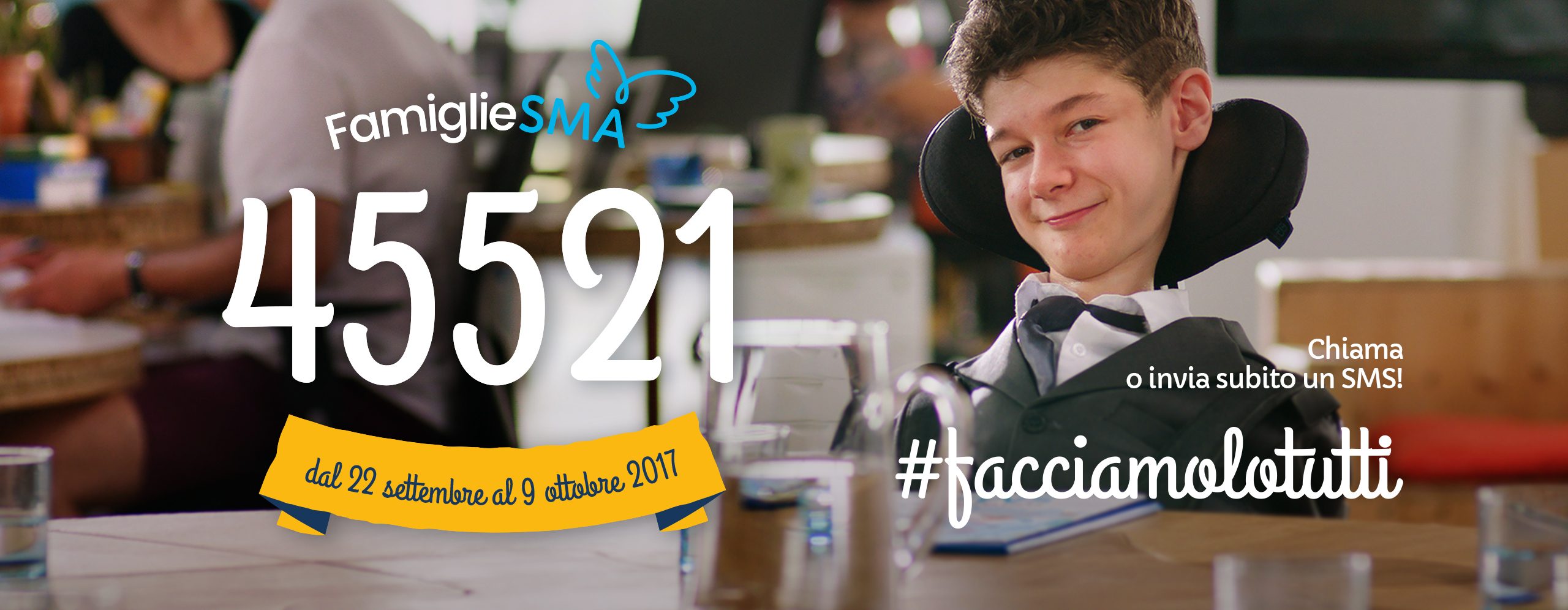 Dal 22 settembre al 9 ottobre l’associazione Famiglie SMA, nata nel 2001 a sostegno della ricerca scientifica, lancia la nuova raccolta fondi nazionale per continuare il percorso sanitario intrapreso in Italia da 130 bambini che hanno avviato il trattamento presso cinque centri coinvolti (NeMo di Milano, Roma e Messina; Gaslini di Genova e Bambino Gesù di Roma) grazie alle donazioni e alla distribuzione gratuita in via compassionevole con l’Extended Access Program.