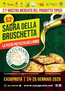 Casaprota si prepara ad accendere l’inverno sabino con uno degli appuntamenti gastronomici più attesi del territorio: la Sagra della Bruschetta, in programma sabato 24 e domenica 25 gennaio 2026, giunta alla sua 63ª edizione e affiancata dalla 21ª Mostra Mercato del Prodotto Tipico.