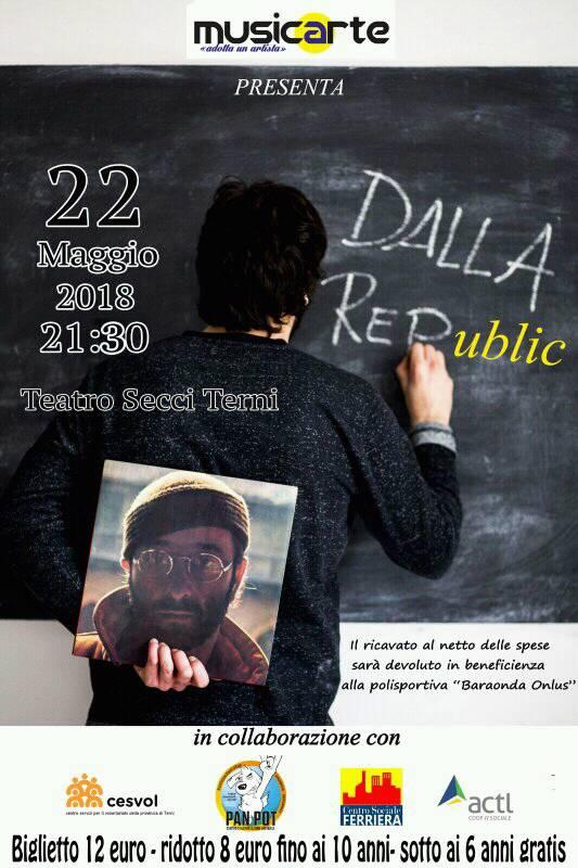 Martedì 22 maggio, alle 21 e 30, al teatro Secci di Terni torna in scena il “Dalla Republic-Tributo a Lucio Dalla”, spettacolo teatrale-musicale nato da un’idea di Giovanni Tasca.