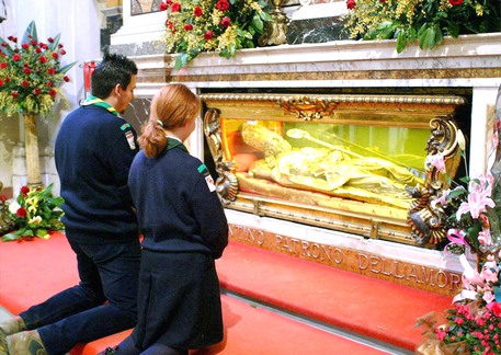 AnsaSan Terni 14 02 2001.Boy-Scout, Fidanzati in preghiera sulla tomba di S Valentino. Nella basila sono custodite le spoglie del Santo,protettore degli innamorati e della citta’ di Terni.