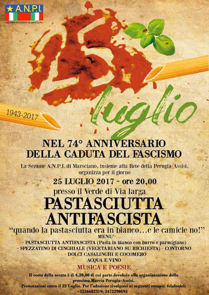 La pastasciutta antifascista è organizzata dall’ANPI di Marsciano in collaborazione con la Rete della Perugia-Assisi.
